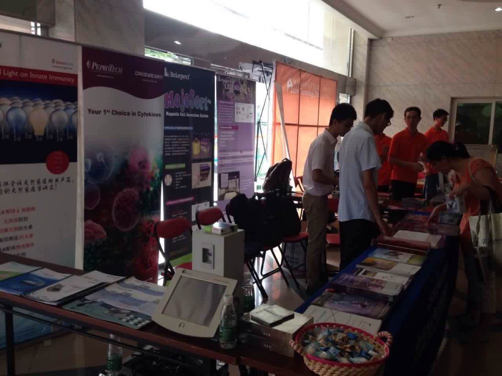 我司在A1號展臺,準備了5副免疫殺撲克牌供展覽用,同時帶來公司的產品目錄冊以及免疫組(小彩圖:mechanisms of cell death,DC、巨噬細胞,中彩圖:Breg,Treg,th17)等資料以及細胞組的轉染、細胞治療組的PPT和儀器彩頁等資料供參會人員瀏覽,展臺的兩邊我們放置了多因子、磁珠分選等3個易拉寶供參會人員觀看,技術部同事現場進行技術儀機器演示。