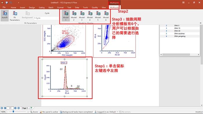 a.在細胞周期分析的模板中,有不同的模板可以調用,用戶可以根據自己的需要,選擇相應的細胞周期數據分析模型,具體操作如下圖所示: