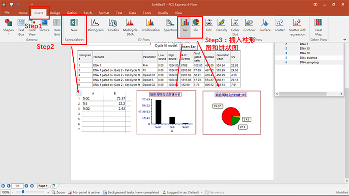 a.舉例,對細胞周期中G1期,S期及G2期各細胞比列的情況分析并做成柱形圖及餅狀圖,直接插入Spreadsheets,然后將相應的數據拖拽入表格中,點擊insert命令按鈕,插入相應的柱形圖和餅狀圖,操作如下: