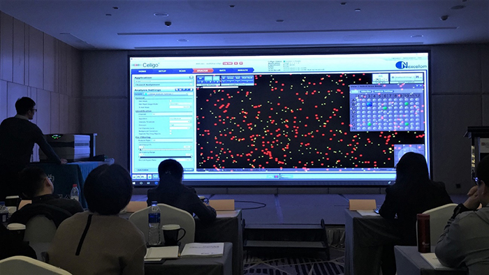 在Nexcelom中國區(qū)應用科學家孫明偉博士操控下,Celigo應用界面在超大的電子屏前一展風采。其快速高效的掃描和分析能力躍然眼前!