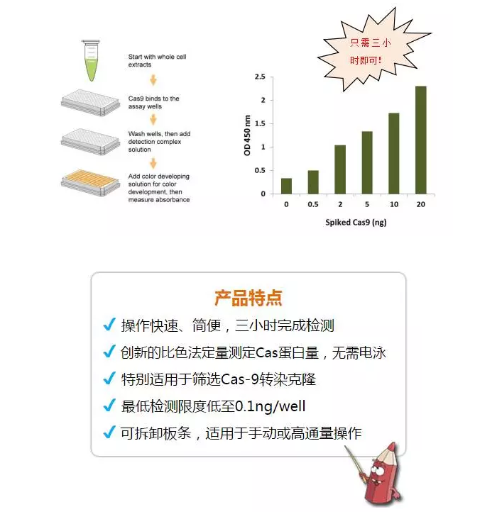 傳統方法操作復雜、花費大量時間與精力,針對這個特點,Epigentek研發出了通過ELISA檢測Cas9蛋白含量,進而篩選轉化子的檢測試劑盒。該試劑盒僅需要純化的Cas9 核酸酶和全細胞提取物(分離自各物種的組織和培養的細胞),就能夠特異性定量檢測CRISPR相關蛋白9(Cas9,dCas9)。