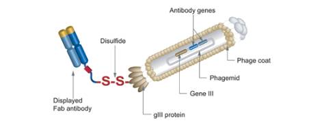 是一項篩選技術,將外源多肽或蛋白與噬菌體的衣殼蛋白融合表達,融合蛋白展示在病毒顆粒的表面,而編碼該融合子的DNA則位于病毒粒子內。