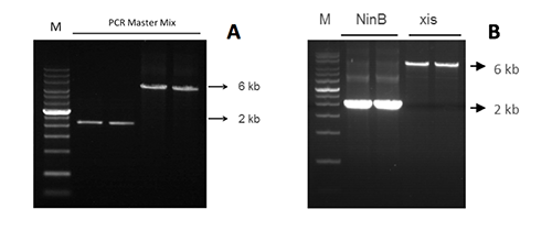 B 使用PCR Dye Mix II擴增NinB基因(2 kb)和xis基因(6 kb)