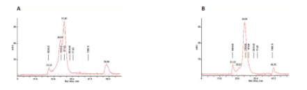 Figure: Analytical SEC of Human serum (Sample for TAC) .  A)  eluted IgG from Hi-BindTM T-Gel Agarose Cat. No. M1313 . B) on Superose 12 HR 10/30 column in 50 mM sodium phosphate; 0.3 M NaCl pH 7.2 at 0.4 ml/min.