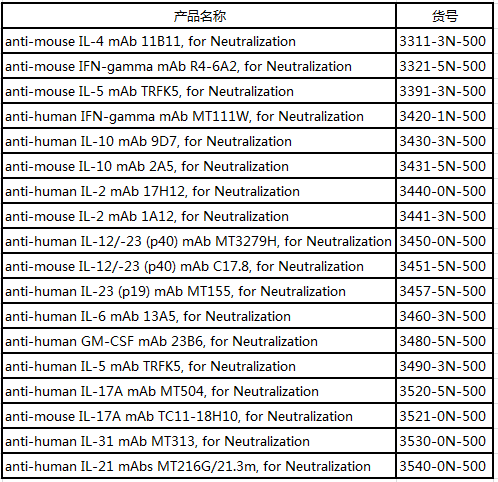 Mabtech除了ELISpot、ELISA相關檢測產品外,還提供人、小鼠等多種指標的中和抗體;并且Mabtech的中和抗體均為單克隆抗體,不含疊氮化鈉,且內毒素含量均低10 EU/mg