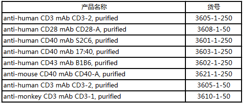 此外,Mabtech還推出了能夠刺激T、B細胞激活的抗體,如:Anti-CD3可作為T細胞多克隆活化劑;Mabtech提供了人和猴的CD3單克隆抗體,它能激活多種細胞因子的釋放,包括IFN-γ、IL-2、IL-4、IL-5、IL-10、IL-13和IL-17A。