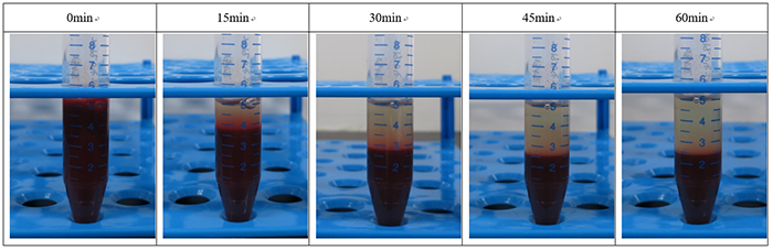 • 按照4:1的比例加入1mL 紅細胞沉降液,混勻,在室溫自然沉降。結果如下圖所示。