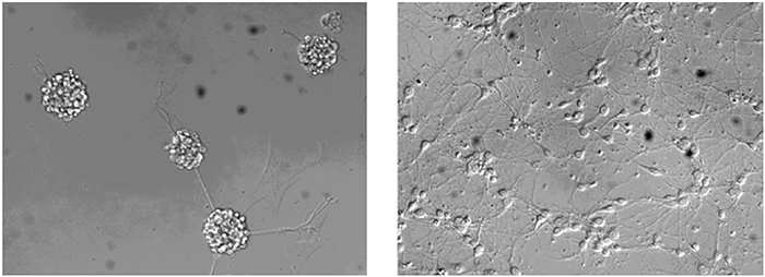 Midkine增強了培養三天的大鼠胚胎(E18)皮層神經元的神經突起生長;左(未處理),右(0.4 μg/mL的人Midkine