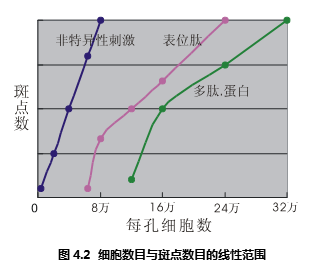 非特異性的刺激物可以直接刺激淋巴細胞,這種刺激不依賴于APC或者其它輔助細胞,是單細胞反應行為。所以它對細胞密度沒有要求,在極寬的細胞濃度范圍之內——多至40萬/孔,低至5千/孔——斑點數量和細胞數量都有簡單的正比例關系,參見圖4.2。但是考慮到,只有恰當的斑點數目才便于數據統計,所以推薦細胞密度為10萬/孔。如果細胞數目過多,滿孔都會被斑點覆蓋,并且相互重疊。