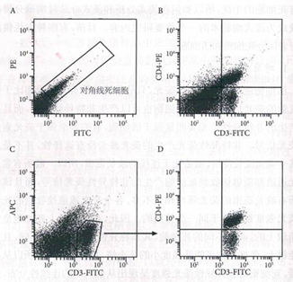 雖然死細胞位于散點圖的對角線上,但是對角線上的細胞確不一定是死細胞,因為雙陽性細胞如果在x軸和y軸的熒光信號相似時,也可以位于對角線上。所以,散點圖對角線上的細胞可能是死細胞,也可能是雙陽性細胞。如圖1-B所示,樣本細胞為正常小鼠脾臟細胞,標(biāo)記 FITC-抗CD3抗體和PE-抗CD4抗體,F(xiàn)ITC和PE雙陽性的CD4 T細胞和死細胞混在一起,無法區(qū)分。但是死細胞和雙陽性細胞的形狀是不一樣的,死細胞呈現(xiàn)連續(xù)的線型分布,而雙陽性細胞群呈現(xiàn)圓形的群體分布,因此,可以從對角線上的細胞群體的形狀大致判斷細胞的性質(zhì)。雖然不能根據(jù)熒光強度的強弱來區(qū)分該熒光信號是來自于死細胞的非特異性熒光還是來自熒光素產(chǎn)生的熒光,但是可以利用在散點圖上死細胞位于對角線的特點來區(qū)分死細胞和陽性活細胞。如圖1-C所示,x軸表示FITC通道(樣本細胞標(biāo)記有FITC-抗CD3抗體),y軸表示APC通道(閑置通道),借用該散點圖可以明確區(qū)分圖1-B中無法區(qū)分的死細胞和雙陽性細胞。此時只需要將排除了死細胞后的CD3 T細胞設(shè)門,將門內(nèi)的細胞顯示于新的FITC-PE散點圖中,如圖1-D,此時該散點圖內(nèi)的細胞都是活細胞,因為樣本細胞同時標(biāo)記有PE-抗CD4抗體,所以圖中的細胞明顯分為兩群,雙陽性的是CD4T細胞,單陽性的是CD8 T細胞。