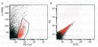 PE-Cy5通道(通常是FL3,接收的熒光波長范圍大致為655-685nm)有時可用于識別死細胞,但首先該通道必須是閑置的通道,及樣本細胞中沒有標(biāo)記該通道代表的熒光素(PE-Cy5、PerCP等)偶聯(lián)抗體。選擇PE-Cy5-SSC散點圖,一般可看到不成群的PE-Cy5陽性細胞,這些陽性細胞的SSC值也是散在分布的,這些散在的PE-Cy5通道非標(biāo)記陽性細胞,即圖2-A中的紅色部分,將這部分細胞設(shè)門顯示于FITC-PE散點圖中,如圖2-B所示,這部分PE-Cy5通道非標(biāo)記陽性細胞基本都位于對角線部分,而對角線細胞一般為死細胞,所以散在的PE-Cy5通道非標(biāo)記陽性細胞一般就是死細胞。