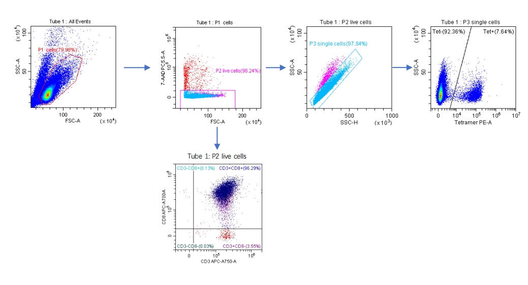 5、使用流式細胞儀對細胞進行分析,基于DAPI對活細胞圈門,并對“CD8+ pMHC -四聚體+細胞進行分類;