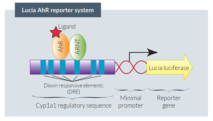 HT29-Lucia?AhR細胞和HepG2-Lucia?AhR細胞通過監測Cyp1a1誘導的Lucia熒光素酶活性提示AhR激活狀況。微粒體細胞色素P450依賴性單氧化酶Cyp1a1基因是重要的AhR靶基因,在這兩個細胞系中,Lucia熒光素酶報告基因都在人Cyp1a1的完整調控序列的控制之下。當配體結合時,細胞質AhR發生構象改變,跨膜進入細胞核,并與ARNT結合,以結合Cyp1a1調節序列中的二惡英反應元件(DRE)。 AhR的激活可以通過QUANTI-Luc?測定細胞培養上清中分泌的熒光素酶活性來評估。HT29-Lucia? AhR細胞和 HepG2-Lucia? AhR細胞對Zeocin?具有抗性。兩種細胞系都用TCDD、FICZ、ITE和L-KynureninePlus(L-型犬尿氨酸的制備物)進行了功能測試。